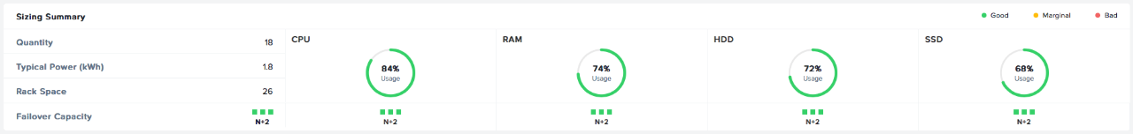 詳細的 Sizer 報告會針對預期的基礎架構資源用量提供詳細資訊,特別是基礎架構與彈性復原的支出以及有效容量。使用報告資料進行「假設」分析,以決定最適合你組織的解決方案。